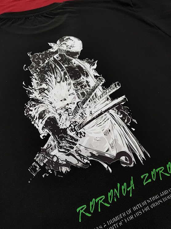 ANIME ARTWORK: Showcases striking One Piece characters Monkey D. Luffy and Roronoa Zoro graphic prints, perfect for anime enthusiasts